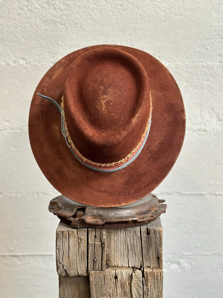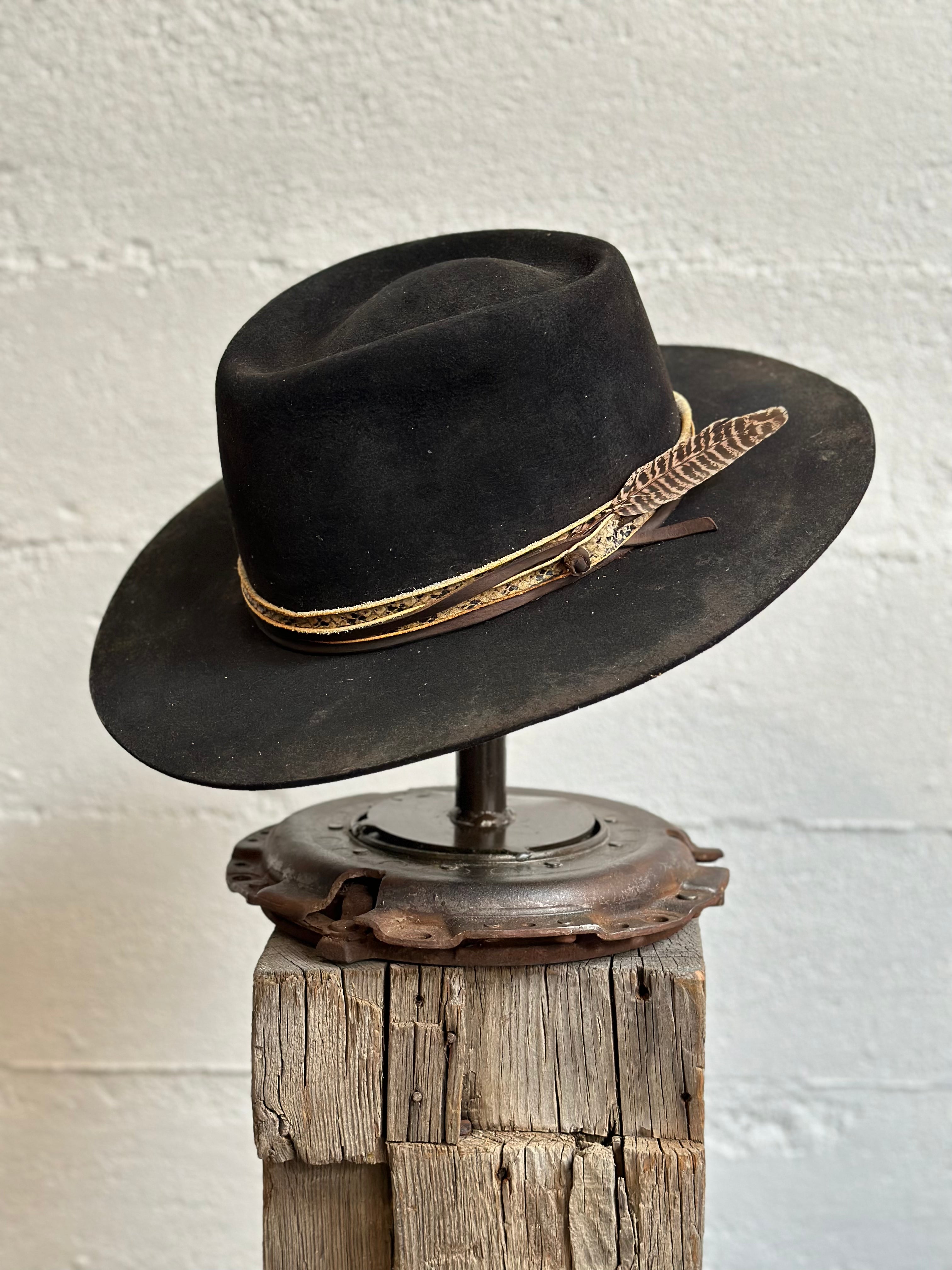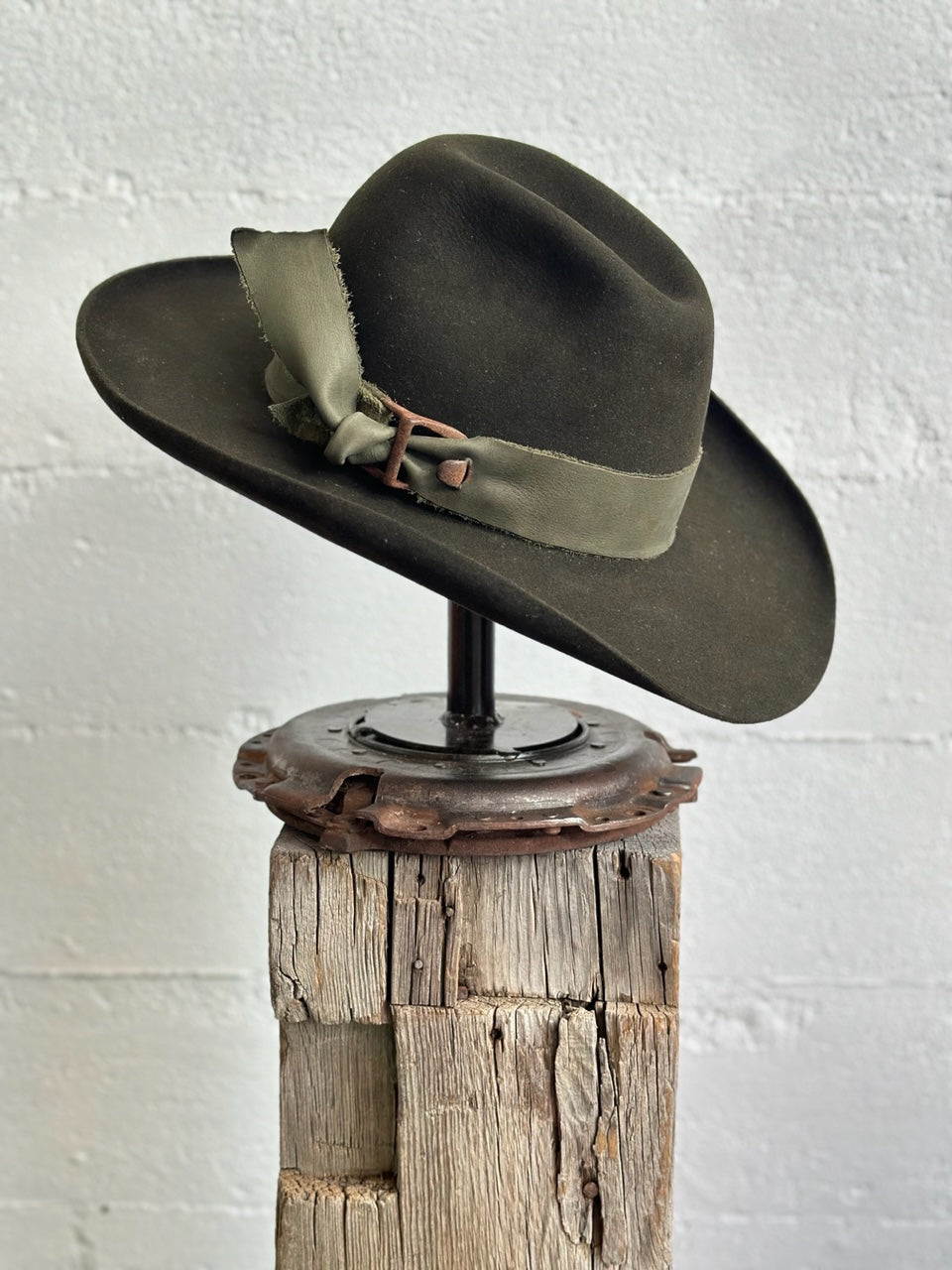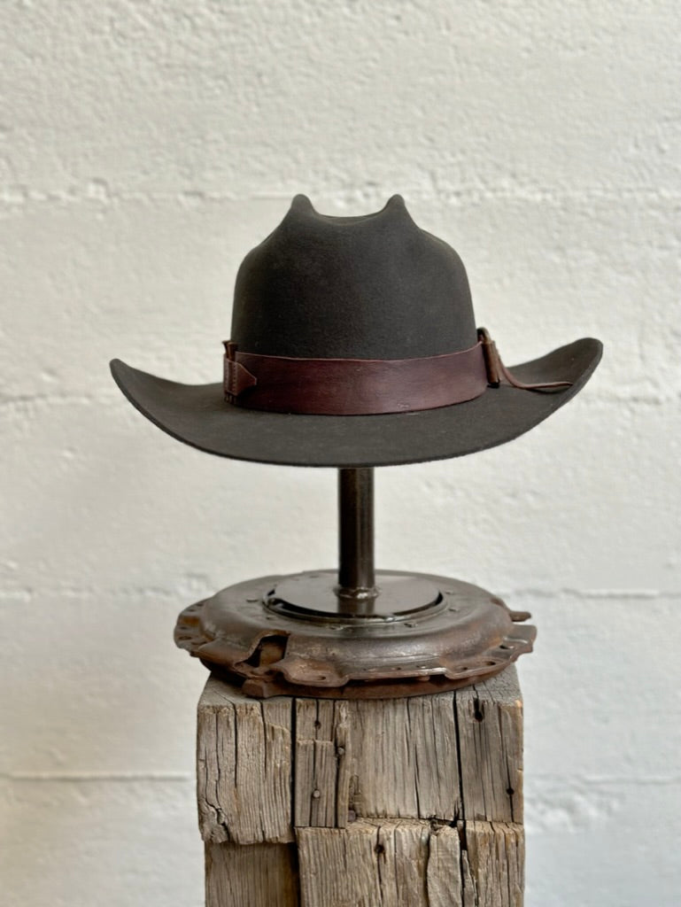 These are long lasting, lifetime hats. Available in a variety of weights to suit a fisherman on the water or a rancher in year round elements. Made special to your measurements and specifications. Distressed to look like its 10 years old? We can do that. Custom dye job? We got you. Patches and branding? Yep, that too. Vintage cards, incredible feathers, stones from the Yellowstone river? ALL included. Colors depend on felt type. Most ranchers stand by their forever hat of 100x Beaver, we also love Nutria which can be just as tough and weather resistant. It is up to you and what you are dreaming of.. reach on out & let's get started.